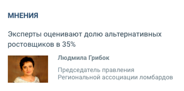 Интервью эксперта Людмилы Грибок, Председателя правления Региональной ассоциации ломбардов, в рубрике "Личное мнение" на информационном портале ZAIM.com : "Эксперты оценивают долю альтернативных ростовщиков в 35%".
