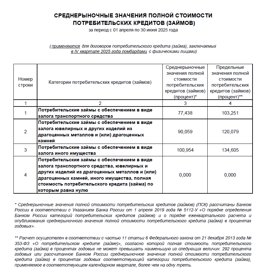 На IV квартал 2025 года установлены предельные среднерыночные значения ПСК103,251 % -Потребительские займы с обеспечением в виде залога транспортного средства,