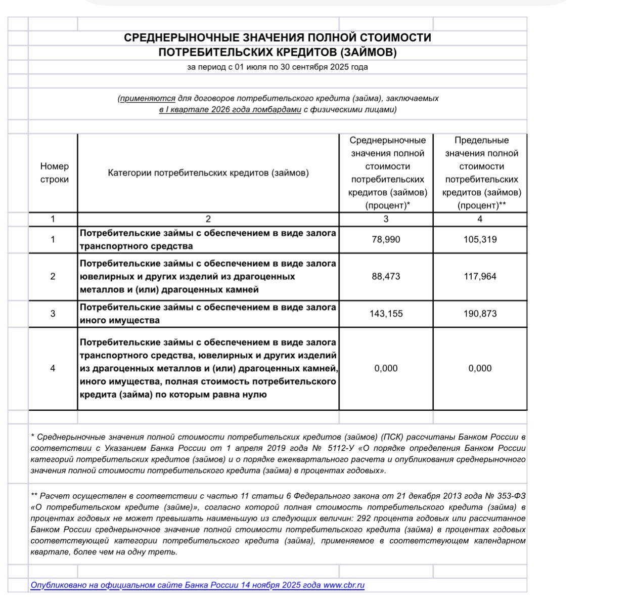 На I квартал 2026 года установлены предельные среднерыночные значения ПСК117,964% - Потребительские займы с обеспечением в виде залога ювелирных и других изделий из драгоценных металлов и (или) драгоценных камней
