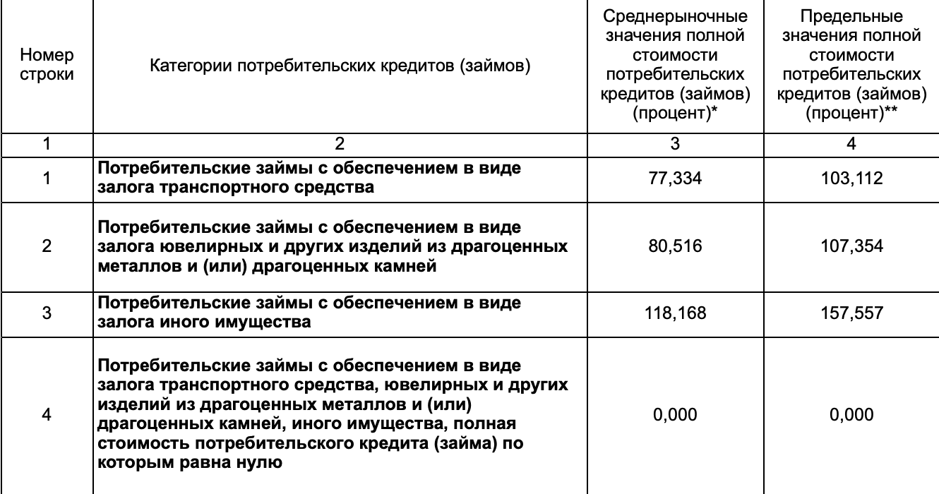 0,0% - Потребительские займы с обеспечением в виде залога транспортного средства, ювелирных и других изделий из драгоценных металлов и (или) драгоценных камней, иного имущества, полная стоимость потребительского кредита (займа) по которым равна нулю