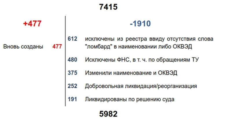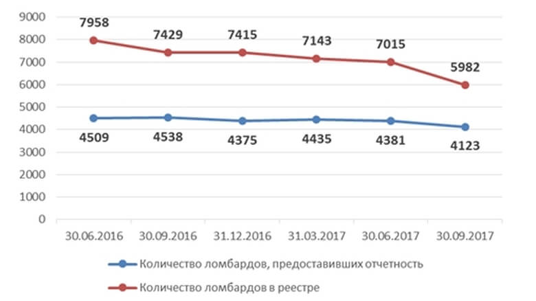 На состоявшемся в Москве Первом Международном Конгрессе Ломбардов Марина Филаретова, начальник Аналитического центра Волго-Вятского главного управления Банка России, представила динамику количества ломбардов и их портфеля займов. Согласно данным ЦБ РФ за девять месяцев 2017 года, список ломбардов потерял 1910 участников, а приобрел 477. Итого отрицательное сальдо в 1433 организации.