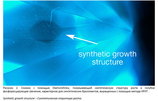 В данном случае бриллиант круглой огранки «бриллиант» (рисунок 1, слева) был предъявлен для обновления сертификата бриллианта. На его рундисте была нанесена метка номера настоящего сертификата GIA, выданного в 2015 году (рисунок 1, справа). Ранее выданный сертификат был выдан на природный, не подвергавшийся обработке бриллиант и содержал следующую оценочную информацию: 1,74 карата, круглая огранка «бриллиант», цвет D, оценка огранки «Excellent» и чистота VVS1. После поведения оценки, то, что было вновь предъявлено, имело такое описание: 1,76 карата круглой огранки «бриллиант» цвета F, оценка огранки «Excellent» и чистота VS1. Кроме того, наши процессы скрининга показали, что этот вновь предоставленный образец требовал дополнительной проверки для определения его происхождения. Эта проверка показала, что он является синтетическим бриллиантом, выращенным с помощью метода НРНТ. На изображении, полученном с помощью прибора DiamondView (рисунок 2), четко видна синтетическая структура роста кристаллов кубооктаэдрической конфигурации и фосфоресценция.