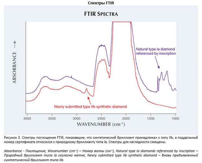Кроме обнаруженных расхождений в весе (1,74 по сравнению с 1,76 карата), цвете (D по сравнению с F) и чистоте (VVS1 против VS1), спектры FTIR (инфракрасной спектроскопии на основе преобразования Фурье) четко показали, что это был не один и тот же камень. Природный бриллиант по подлинному сертификату был типа Ia с агрегированными азотными включениями, а новый камень был типа IIb с включениями бора (рисунок 3). Тщательная проверка номера сертификата, нанесенного на синтетический бриллиант, показала отличие вида шрифта от того, что использовался GIA, подтверждающее, что это была не подлинная надпись.